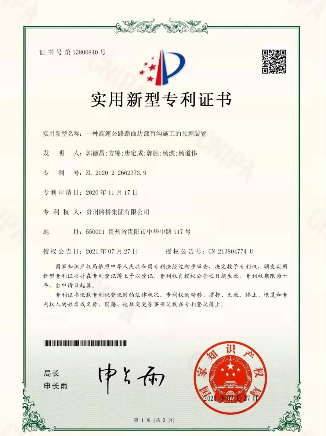 施工過程中,項目部高度重視施工質(zhì)量、安全、進度控制、疫情防控等工作,克服各種困難,積極組織開展了勞動競賽、安全月、質(zhì)量月等活動,創(chuàng)新使用了一種高速公路路面邊部盲溝施工的預(yù)埋裝置、關(guān)模及邊部淋灌水泥漿等先進施工工藝。